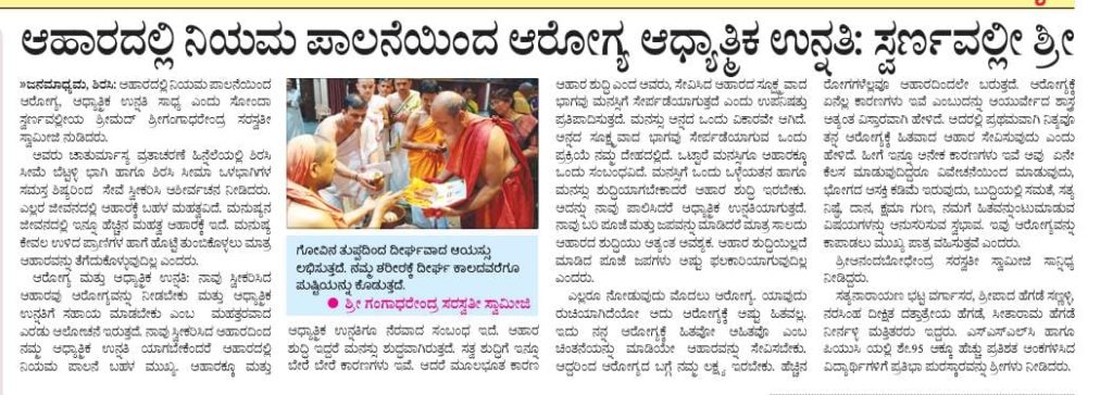 28 Jul 2025 ಆಹಾರದಲ್ಲಿ ನಿಯಮ ಪಾಲನೆಯಿಂದ ಆರೋಗ್ಯ ಆಧ್ಯಾತ್ಮಿಕ ಉನ್ನತಿ; ಸ್ವರ್ಣವಲ್ಲೀ ಶ್ರೀ by swarnavalliseva | posted in: Press Note/News | 0 Share this… Facebook Whatsapp Twitter Gmail Telegram