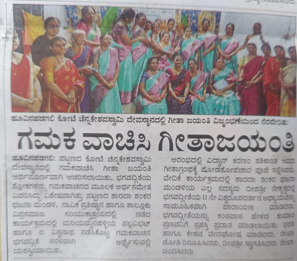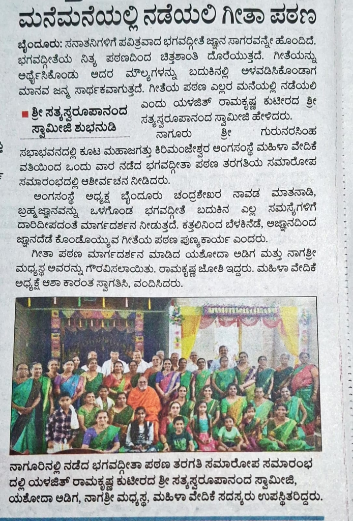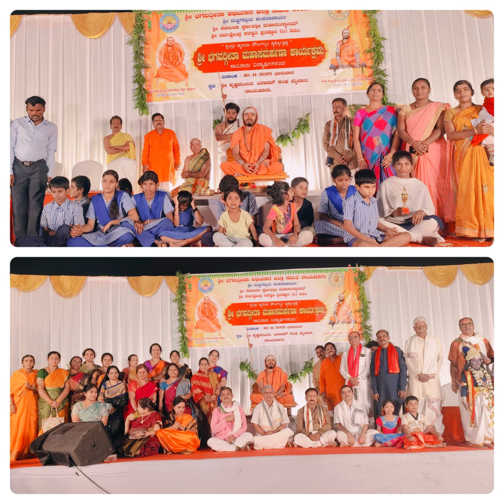 ಶಾಲಾ ಮಕ್ಕಳು ಮತ್ತು ಹಿರಿಯರು ಸೇರಿದಂತೆ ಅನೇಕರು ಭಗವದ್ಗೀತೆಯ 11ನೆ ಅಧ್ಯಾಯವನ್ನು ಪಾರಾಯಣ ಮಾಡಿದರು. ಶ್ರೀ ಗುರುಗಳು ಭಗವದ್ಗೀತೆಯ ಧ್ಯಾನ ಶ್ಲೋಕಗಳ ಅರ್ಥ ಮತ್ತು 11ನೆ ಅಧ್ಯಾಯದ ಕಡೆಯ ಶ್ಲೋಕದ ಅರ್ಥವನ್ನು ಅನೇಕ ಉದಾಹರಣೆಗಳ ಮೂಲಕ….. ಕಥೆಗಳನ್ನು ಹೇಳುತ್ತಾ ಆಶೀರ್ವಚನ ನೀಡಿದರು.