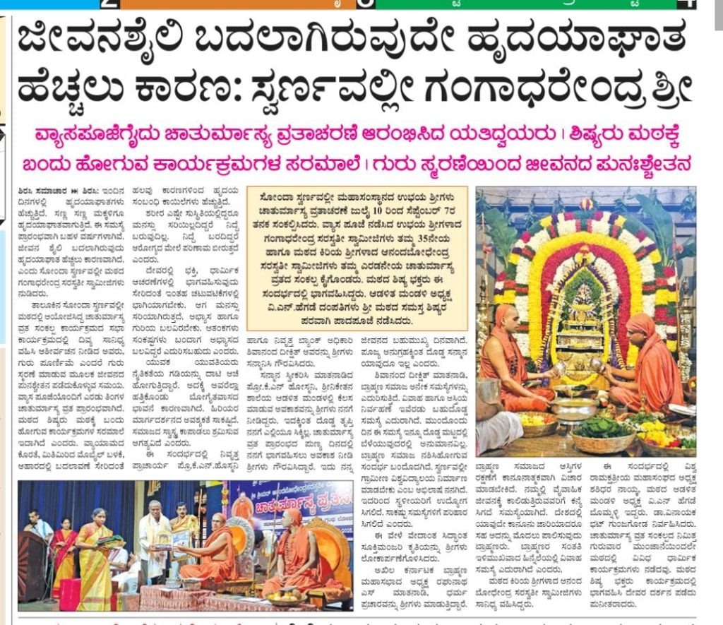 12 Jul 2025 ಜೀವನಶೈಲಿ ಬದಲಾಗಿರುವುದೇ ಹೃದಯಾಘಾತ ಹೆಚ್ಚಲು ಕಾರಣ; ಸ್ವರ್ಣವಲ್ಲೀ ಶ್ರೀ by swarnavalliseva | posted in: Press Note/News | 0 Share this… Facebook Whatsapp Twitter Gmail Telegram
