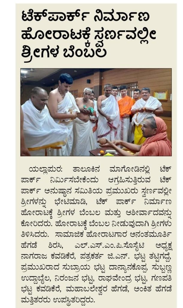 19 Jun 2025 ಟೆಕ್ಪಾರ್ಕ್ ನಿರ್ಮಾಣ ಹೋರಾಟಕ್ಕೆ ಸ್ವರ್ಣವಲ್ಲೀ ಶ್ರೀಗಳ ಬೆಂಬಲ by swarnavalliseva | posted in: Press Note/News | 0 Share this… Facebook Whatsapp Twitter Gmail Telegram