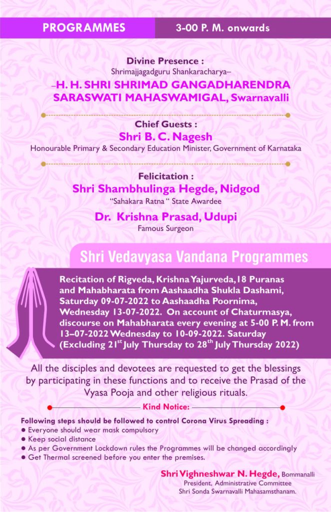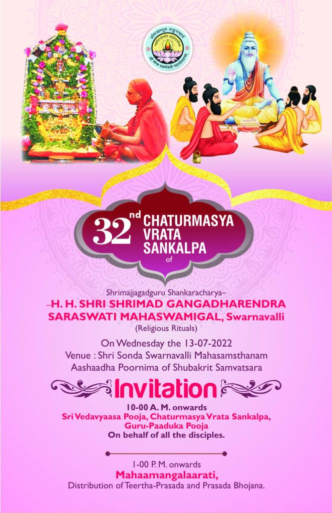 ಶ್ರೀ ಶ್ರೀಮದ್ ಗಂಗಾಧರೇಂದ್ರ ಸರಸ್ವತೀ ಮಹಾಸ್ವಾಮಿಗಳವರ 32ನೇ ಚಾತುರ್ಮಾಸ್ಯ ವ್ರತವು ಈ ವರ್ಷ ಶುಭಕೃತ್ ಸಂವತ್ಸರದ ಆಷಾಢ ಪೂರ್ಣಿಮಾ (ಗುರು ಪೂರ್ಣಿಮಾ) ದಿನಾಂಕ 13-07-2022, ಬುಧವಾರದಂದು ಪ್ರಾರಂಭವಾಗಿ ದಿನಾಂಕ 10-09-2022, ಶನಿವಾರ ಭಾದ್ರಪದ ಪೂರ್ಣಿಮೆಯಂದು ಸಂಪನ್ನಗೊಳ್ಳಲಿದೆ. ಚಾತುರ್ಮಾಸ್ಯ ವ್ರತಾಚರಣೆಯ ದಿನಗಳಲ್ಲಿ ಸೀಮೆ/ ಭಾಗಿ ಹಾಗೂ ವಿವಿಧ ಸಮಾಜ ಬಾಂಧವರು, ರಾಮ ಕ್ಷತ್ರಿಯ ಸಂಘಗಳು, ಸ್ವರ್ಣವಲ್ಲೀ ಸೇವಾ ಪ್ರತಿಷ್ಠಾನಗಳ ಶಿಷ್ಯ ಭಕ್ತರುಗಳಿಂದ ಪ.ಪೂ ಶ್ರೀಗಳವರ ಭಿಕ್ಷಾ, ಪಾದಪೂಜೆ ಕಾರ್ಯಕ್ರಮಗಳನ್ನು ಕೈಗೊಳ್ಳಲು ಆಯೋಜಿಸಲಾಗಿದೆ. ಈ ಸಂದರ್ಭದಲ್ಲಿ ಆಯಾ ಸೀಮಾ ಮಾತೃಮಂಡಲ ಸದಸ್ಯರಿಂದ ಸಾಮೂಹಿಕ ಕುಂಕುಮಾರ್ಚನೆ ನಡೆಯಲಿದೆ. ಶ್ರೀಮಠದ ಸಮಸ್ತ ಶಿಷ್ಯರೂ ಈ ಕಾರ್ಯಕ್ರಮಗಳಲ್ಲಿ ಭಾಗವಹಿಸಿ ಪ.ಪೂ. ಶ್ರೀಗಳವರ ಆಶೀರ್ವಾದ ಮಂತ್ರಾಕ್ಷತೆ ಹಾಗೂ ಆರಾಧ್ಯ ದೇವರುಗಳ ಅನುಗ್ರಹ ಪಡೆದು ಕೃತಾರ್ಥರಾಗಬೇಕಾಗಿ ವಿನಂತಿ. ಪುರುಷರು ಗಾಯತ್ರಿ ಜಪಾನುಷ್ಠಾನದಲ್ಲಿ ಪಾಲ್ಗೊಳ್ಳಬೇಕೆಂದು ಪ.ಪೂ. ಶ್ರೀಗಳವರ ಅಪೇಕ್ಷೆಯಾಗಿದೆ.